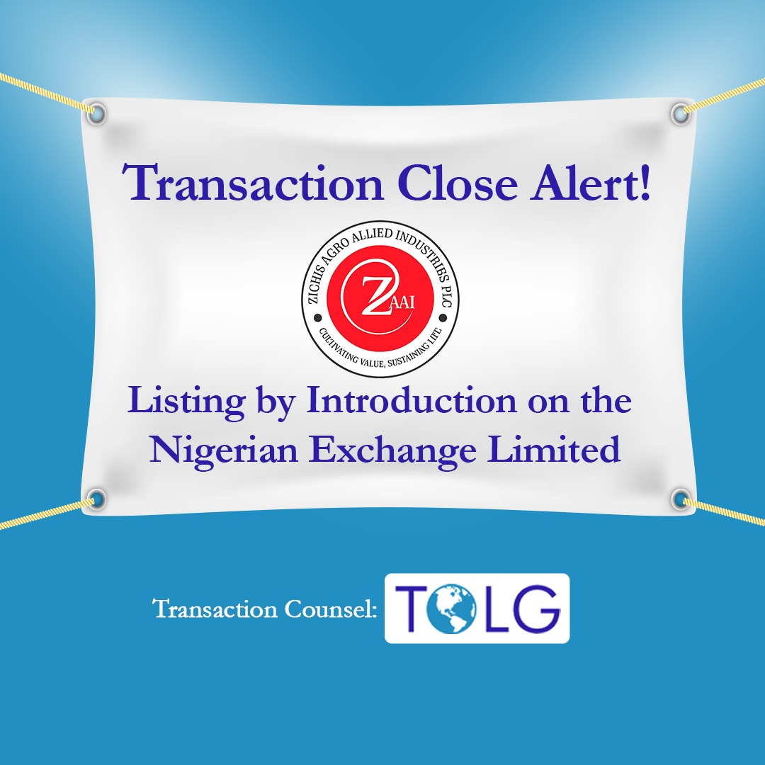 We are pleased to announce that TOLG acted as Transaction Counsel to Zichis Agro-Allied Industries Plc in connection with its Listing By Introduction on the Growth Board of the Nigerian Exchange Limited (NGX). The Company held its Completion Board Meeting (CBM) on Tuesday, January 13, 2026. The CBM marked the successful completion of arrangements for… Continue reading Transaction Counsel to Zichis Agro-Allied Industries Plc